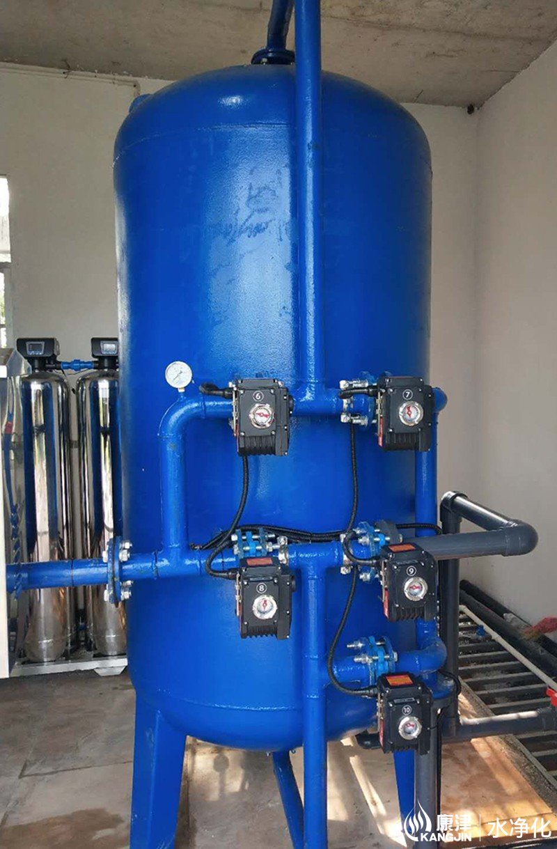 6月中旬在三塘鎮(zhèn)六村完工一臺(tái)壓力式凈水設(shè)備,該設(shè)備采用碳鋼罐體φ1000*2500系統(tǒng)控制為PLC程序控制器、人機(jī)界面觸摸屏;10套電動(dòng)閥門(mén)材質(zhì):碳鋼閥體采用304不銹鋼板。整套凈水設(shè)備的過(guò)濾流程為原水箱-加藥設(shè)備-原水泵-多介質(zhì)過(guò)濾器。