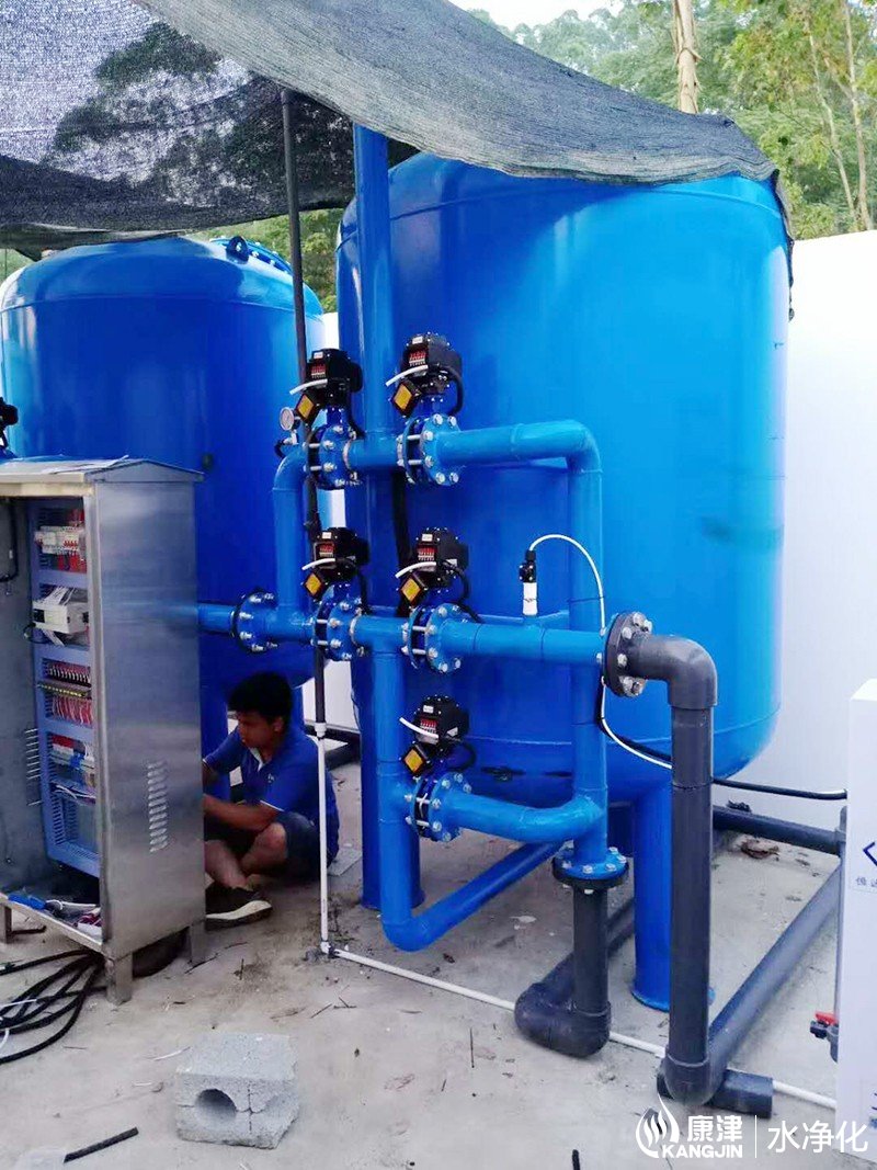 設備是壓力式的,其原理是當原水自上而下通過濾料時,水中懸浮物由于吸附和機械阻流作用被濾層表面截留下來;當水流進濾層中間時,由于濾料層中的砂粒排列的更緊密,使水中微粒有更多的機會與砂粒碰撞,于是水中凝絮物、懸浮物和砂粒表面相互粘附,水中雜質截留在濾料層中,從而得到澄清的水質。經過濾后的出水懸浮物可在3毫克/升以下。