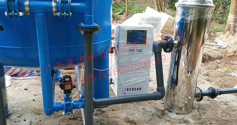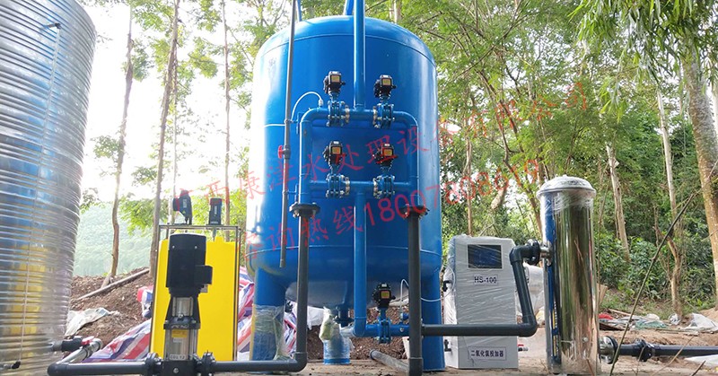 工藝流程:河水-原水箱-石英砂過濾器-精密過濾器-二氧化氯消毒-加壓泵-高位水塔