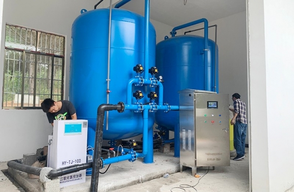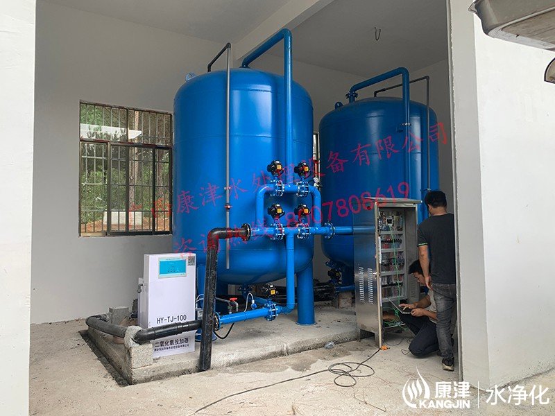 工藝流程:山泉水-絮凝投加器-石英砂過濾器-二氧化氯加藥器-用水點
