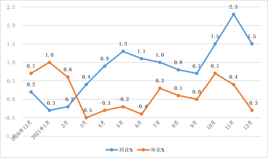 202112月份,全國居民消費價格同比上漲1.5%。其中,城市上漲1.6%,農村上漲1.2%;食品價格下降1.2%,非食品價格上漲2.1%;消費品價格上漲1.5%,服務價格上漲1.5%。