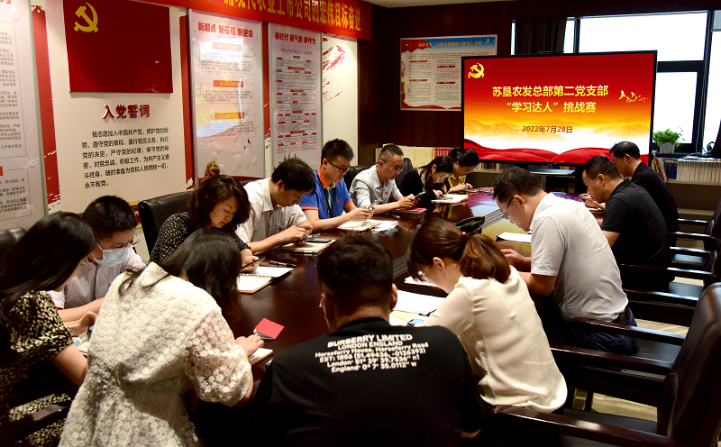 為迎接黨的二十大勝利召開營造良好氛圍,引導支部黨員真正做到學黨史、悟思想、辦實事、開新局,7月28日下午,蘇墾農發總部第二黨支部開展“學史增信 厚植愛國情懷”主題黨日活動,除“第一議題”學習、開講十分鐘、交流學習心得、觀看廉潔文化視頻、現場交納黨費等環節,支部黨員面對面在線上開展了“學習達人”挑戰賽。