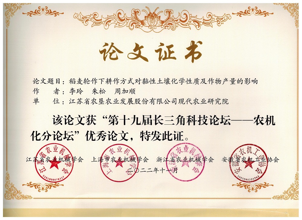 11月21日,江蘇省農(nóng)業(yè)機械學(xué)會、上海農(nóng)業(yè)機械學(xué)會、浙江省農(nóng)業(yè)機械學(xué)會、安徽省農(nóng)機工業(yè)協(xié)會發(fā)布了《關(guān)于表彰“第十九屆長三角科技論壇-農(nóng)機化分論壇”優(yōu)秀論文的決定》(蘇農(nóng)機學(xué)會〔2022〕12號),江蘇省農(nóng)墾農(nóng)業(yè)發(fā)展股份有限公司現(xiàn)代農(nóng)業(yè)研究院為第一單位的兩篇科技論文 “稻麥輪作下耕作方式對黏性土壤化學(xué)性質(zhì)及作物產(chǎn)量的影響” “秸稈還田下濱海黏質(zhì)鹽土肥力演變研究”獲得“第十九屆長三角科技論壇-農(nóng)機化分論壇”優(yōu)秀論文獎。