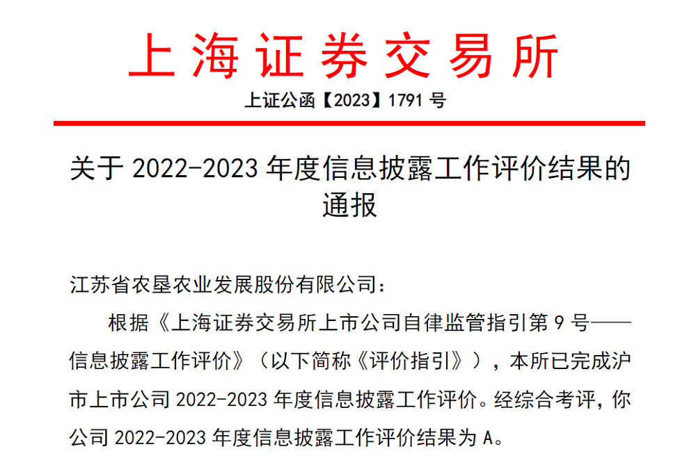 近日,上海證券交易所公布滬市主板上市公司2022-2023年度信息披露工作評價結果,蘇墾農發(股票代碼:601952)再次榮獲信息披露工作“A”級評價(最高級),這也是公司連續第四年獲此殊榮,充分體現了證券監管機構對公司法人治理、信息披露和投資者關系維護等方面工作的高度肯定。