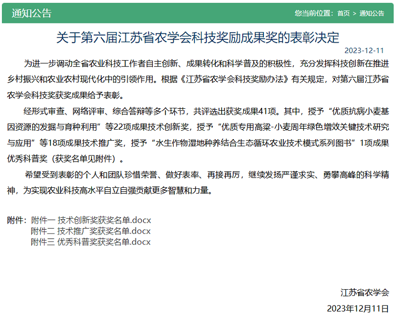 12月11日,第六屆江蘇省農學會科技獎勵成果獎和第六屆江蘇省農學會科技獎勵人才獎獲獎名單公布,蘇墾農發作為第一完成單位申報的“稻麥植保無人飛防高質高效作業技術集成與推廣”成果榮獲技術推廣獎二等獎、“江蘇農墾綠色低碳生產關鍵技術集成與推廣”成果榮獲技術推廣獎三等獎,蘇墾農發現代農業研究院朱松同志榮獲青年科技獎。