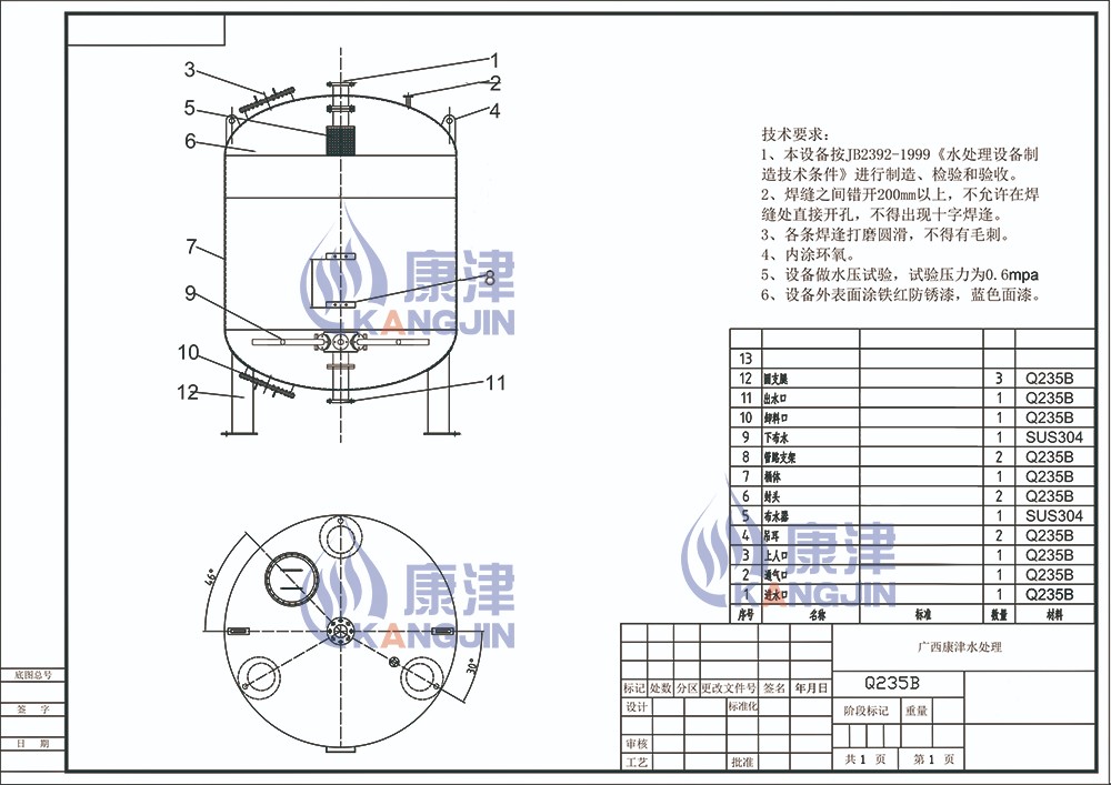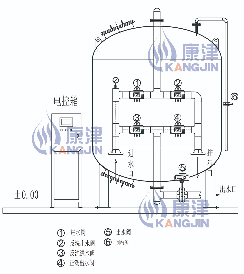 設(shè)備主要由罐體、布水系統(tǒng)、集水系統(tǒng)、濾料層、承托層及內(nèi)部配套管路等組成,外部聯(lián)接原水進(jìn)水、清水出水、反沖洗排水等主要管道和閥門(mén)與其相配的控制系統(tǒng)、壓力表、取樣閥等。
