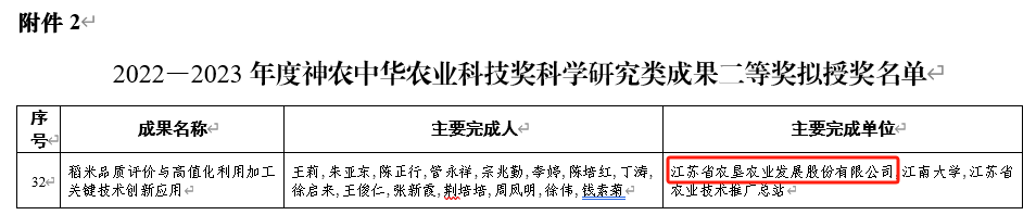 •        近日,2022—2023年度神農中華農業科技獎189項擬授獎成果公示,江蘇省農墾農業發展股份有限公司作為第一完成單位的“稻米品質評價與高值話利用加工關鍵技術創新應用”項目成果成功入圍“2022—2023年度神農中華農業科技獎科學研究類成果二等獎擬授獎名單”。