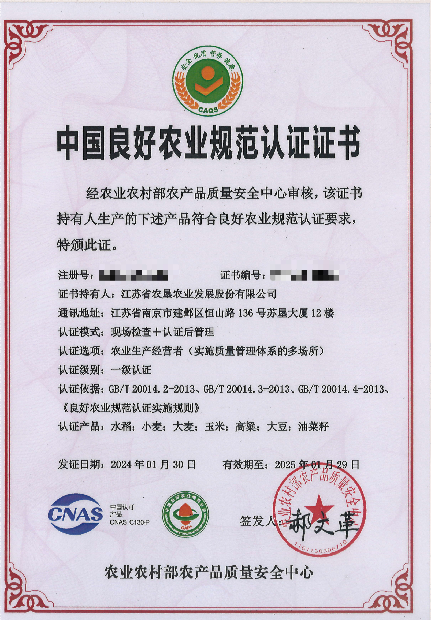 近日,蘇墾農發20個生產基地的水稻、小麥、大麥、玉米、大豆、油菜、高粱等7種作物通過全國良好農業規范(GAP)一級認證,是全國單體規模最大的一級認證單位。