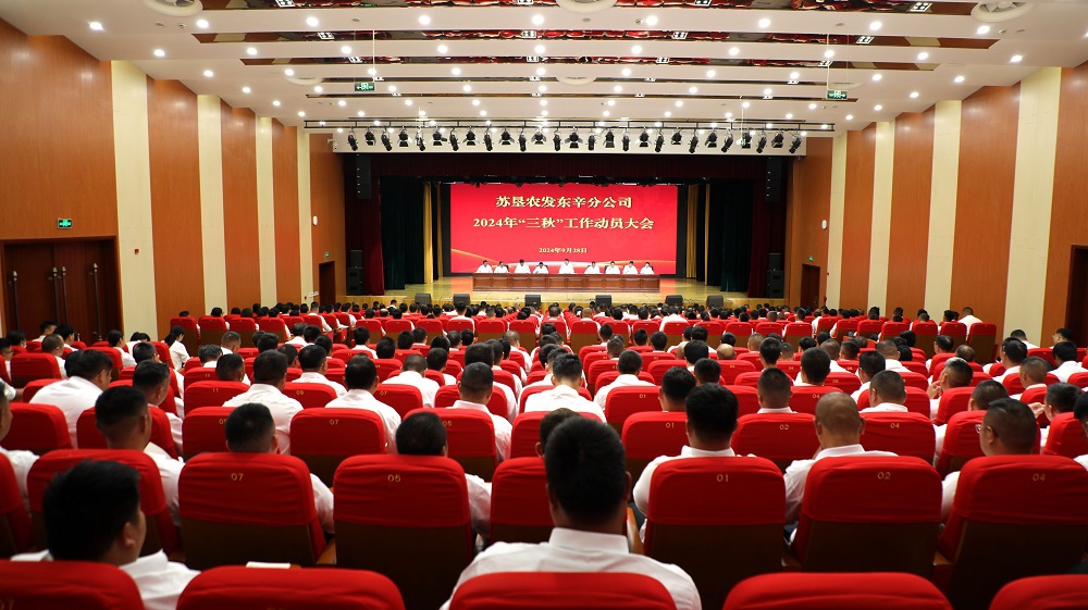 為深入貫徹落實蘇墾農發“三秋”工作會議精神,全力以赴打好“三秋”攻堅戰,9月28日上午,蘇墾農發東辛分公司在文化活動中心召開2024年“三秋”工作動員大會。東辛黨委書記、董事長、蘇墾農發東辛分公司總經理趙志講話,黨委副書記姜杰主持會議,黨委委員、蘇墾農發東辛分公司常務副總經理陳躍武作“三秋”工作動員報告。