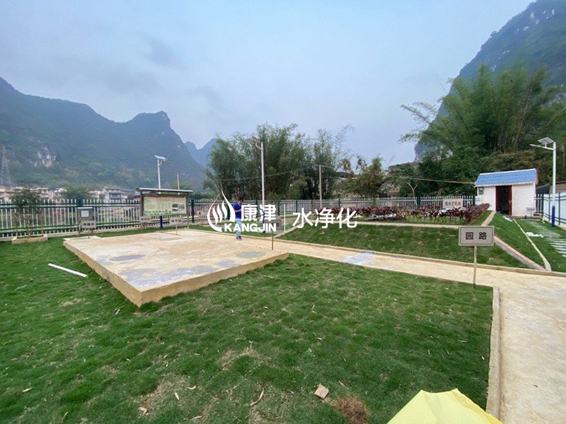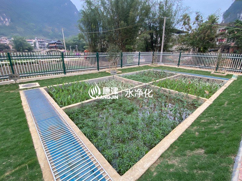 工藝說(shuō)明:村屯生活污水經(jīng)過(guò)收集管網(wǎng)后先經(jīng)過(guò)格柵,攔截大顆粒漂浮物、懸浮物,然后自流到調(diào)節(jié)池,再經(jīng)提升泵進(jìn)入組合式固定床設(shè)備,在組合式固定床設(shè)備中經(jīng)過(guò)缺氧區(qū)、好氧區(qū)等多級(jí)反應(yīng)區(qū)處理,接著進(jìn)入沉淀池進(jìn)行污泥沉淀,一部分污泥回流前部缺氧區(qū),剩余污泥排至污泥池。沉淀池出水流入人工濕地,在此污水中的有機(jī)污染物通過(guò)人工濕地的生物氧化、吸附、降解。人工濕地出水經(jīng)出水井外排至附近池塘下游。最后達(dá)標(biāo)排放。調(diào)節(jié)池、污泥池前格為污泥硝化區(qū),污泥硝化區(qū)內(nèi)的污泥通過(guò)厭氧消化后定期采用吸糞車抽吸外運(yùn)堆肥處理。