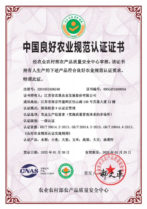 2024年,蘇墾農發為強化農產品生產全過程的質量與安全管理,提高種植基地農業生產標準化、規范化和可持續發展水平,認證并通過了20家種植基地水稻、小麥、大麥、玉米、大豆、油菜、高粱等7種作物的全國良好農業規范(GAP)一級認證,率先通過農業農村部農產品質量安全中心良好農業規范(GAP)質量管理體系的多場所認證,是全國單體規模最大的一級認證單位。一年來,公司依托全產業鏈縱向一體化管理優勢,對種植基地生產環境質量、投入品使用、農產品質量控制等方面進行嚴格規范化管理,全面提升農業生產標準化、規范化管理水平,為公司農業生產可持續發展提供了保障。